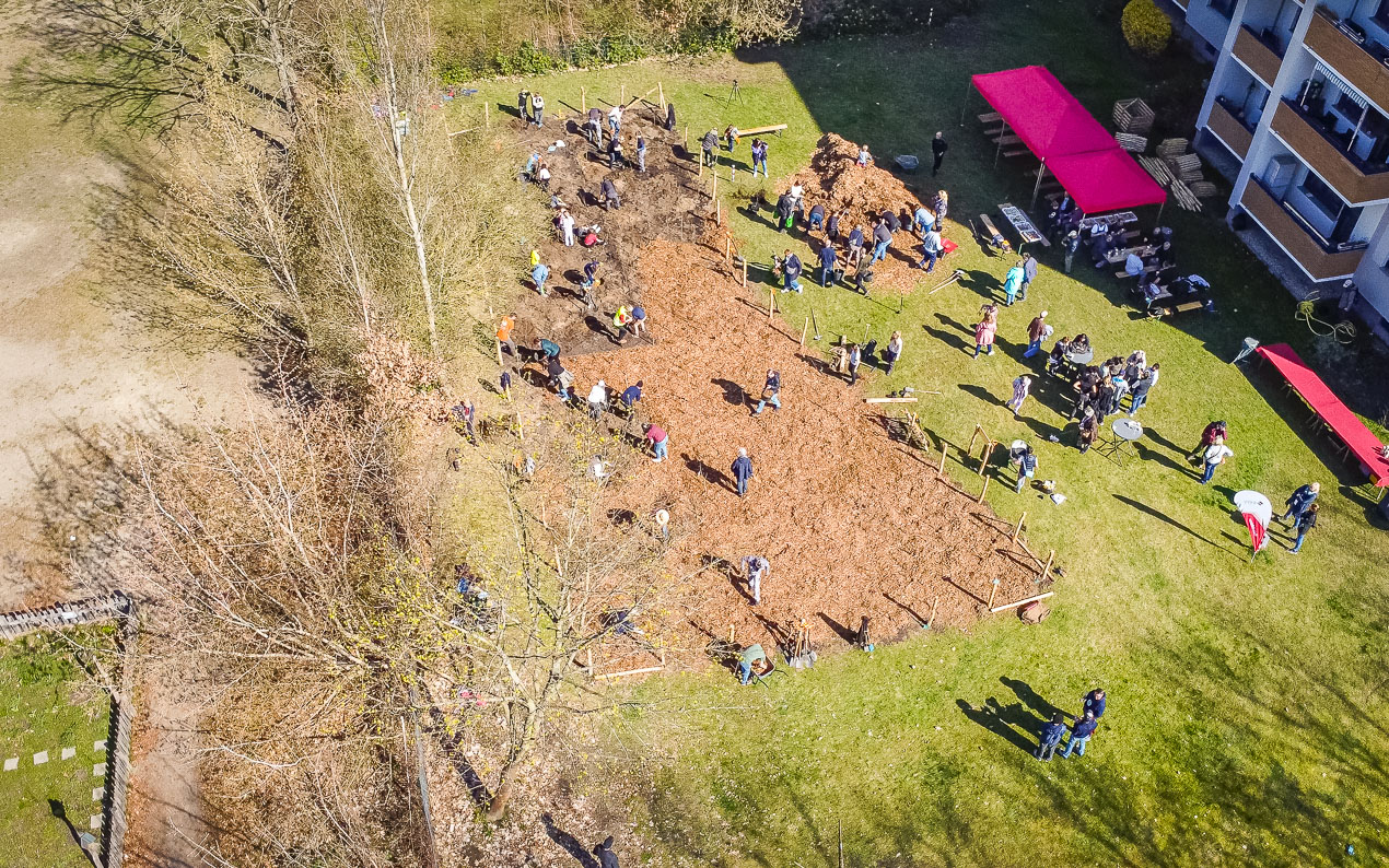 Die Waldexperten vom MIYA Forest e. V., gut erkennbar an ihren orangen T-Shirts, bereiteten unterdessen die Fläche vor. Eine Anwohnerin saß auf ihrem Balkon und stellte interessierte Fragen. Und damit die Erwachsenen die ganze Arbeit nicht allein machen mussten, kamen ihnen gegen 10 Uhr auch noch 23 Drittklässler mit ihren beiden Lehrerinnen zu Hilfe.