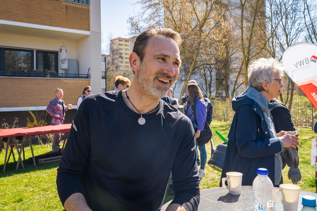 Beim Pflanztag in Marienfelde konnte man gut beobachten, wie das in der Praxis geht. Am Anfang standen die Freiwilligen noch in kleinen Grüppchen zusammen. Ein Teil stärkte sich mit den belegten Brötchen, die der Beamten-Wohnungs-Verein zur Verfügung gestellt hatte.